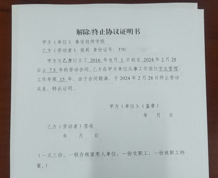 “我在學院工作了31年,在50歲即將辦理退休的年紀卻遭學校解聘,教師生涯終止了,同時也沒辦法辦理退休,感覺非常的寒心。”3月27日,山東省泰安市居民張莉告訴上游新聞記者,她曾是山東省泰安市泰安技師學院一名合同制教師,自1993年起,她在該學院及其前身學校連續工作31年,已年滿50歲。在2024年2月,臨近退休時,卻被學院以勞動合同到期不再續期為由終止合同。