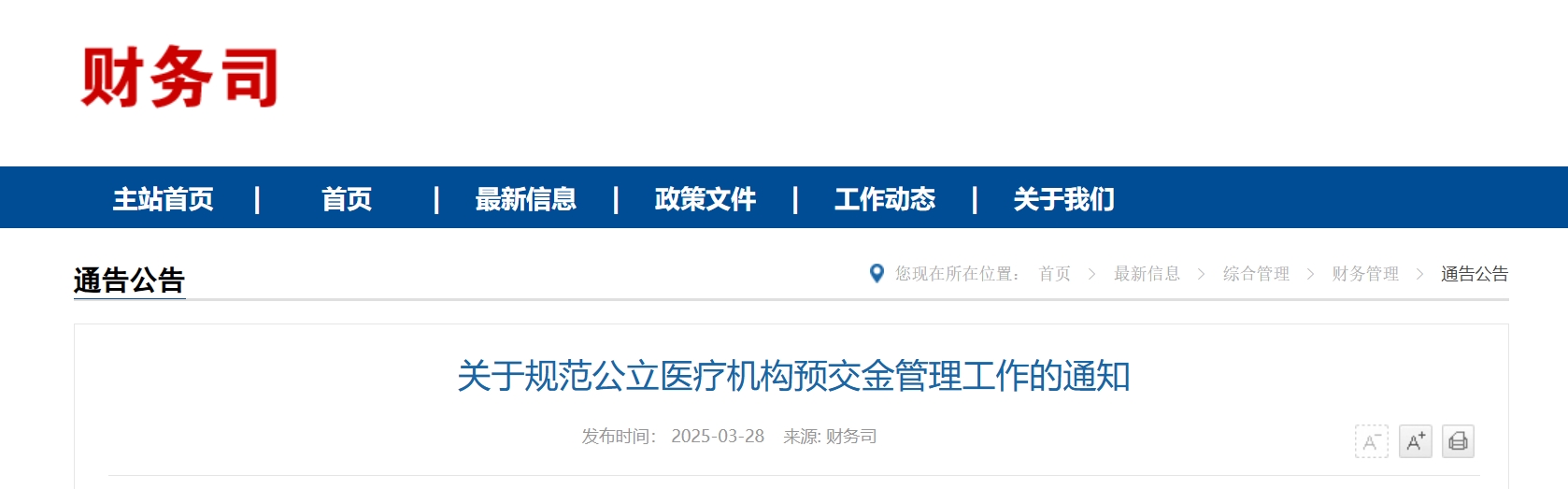 自2025年3月31日起,公立醫療機構要全面停止收取門診預交金,2025年12月31日前完成存量門診預交金的資金清算、退款。公立醫療機構要加強對存量門診預交金退費受理、審核、確認、退款等全流程的監管。