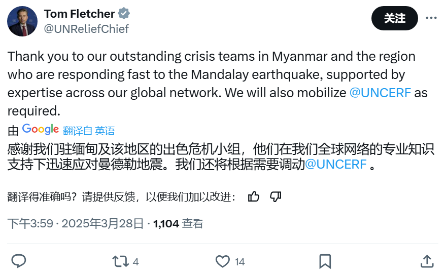 聯合國主管人道主義事務的副秘書長湯姆·弗萊徹在社交媒體宣佈,將調撥“聯合國緊急基金”(CERF)協助應對此次緬甸地震。
