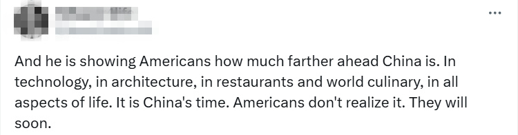“他向美國人展示了中國有多麼領先。無論是技術、建築、餐廳還是世界烹飪,還是生活的各個方面。這是中國時代。許多美國人還沒有意識到這一點。但他們很快就會意識到。”