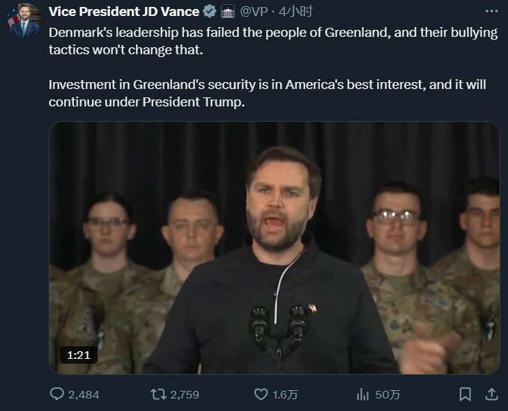 “總統説‘我們必須擁有格陵蘭島’,我認為我們必須更加認真地對待格陵蘭島的安全問題。”萬斯在美軍基地表示,“我們不能忽視這個地方。我們不能忽視總統的願望。”