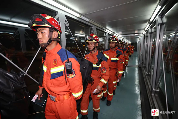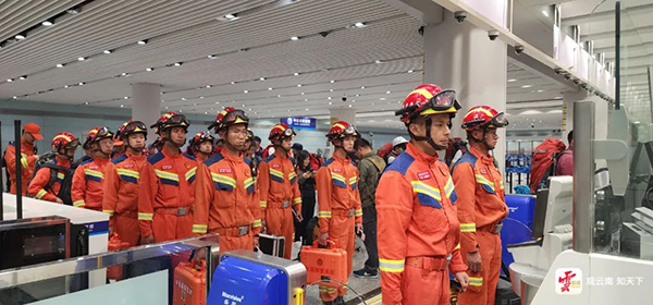 3月29日6時許,中國雲南救援醫療隊一行37人,攜帶全功能生命探測儀、地震預警系統、便攜式衞星、無人機等應急救援物資共112台套從昆明長水國際機場出征赴緬。