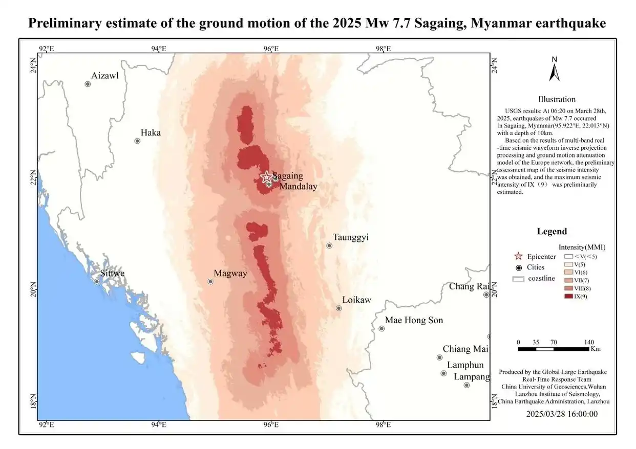 初步計算的緬甸地震烈度圖 中國地質大學(武漢)和中國地震局蘭州地震研究所團隊