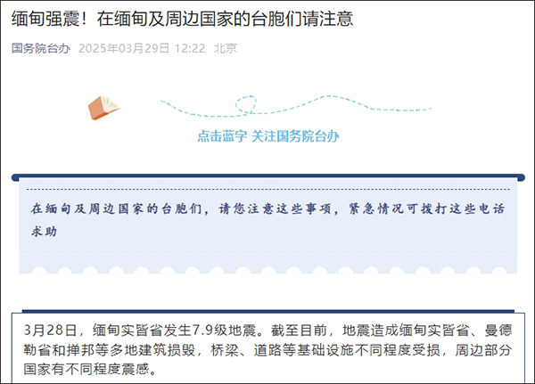 微信公眾號“國務院台辦”3月29日發佈消息稱,在緬甸及周邊國家的台胞們,請您注意這些事項,緊急情況可撥打這些電話求助。