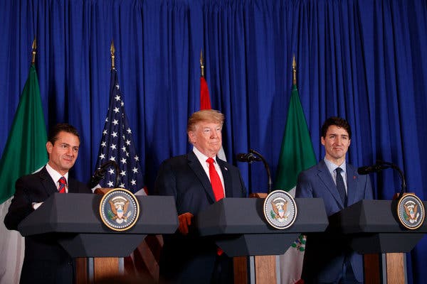 2018年11月30日,時任墨西哥總統培尼亞、美國總統特朗普和加拿大總理特魯多簽署USMCA。 紐約時報