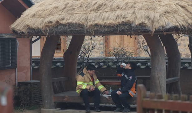 當地時間3月27日,大火瀰漫的慶尚北道安東市河回村消防員的進餐畫面也被拍到。畫面中,消防員們在救火間隙吃着紫菜包飯等小吃。