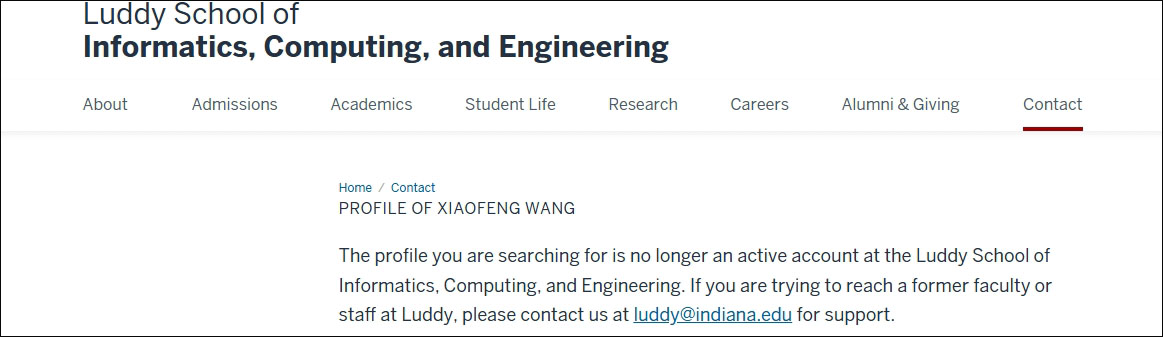王曉峯的個人資料已從盧迪學院網站刪除。網頁存檔顯示,王曉峯自2004年起進入印第安納大學任職,曾任該院副院長,主導過一個價值近2300萬美元的研究項目,並擔任安全與隱私研究中心主管。