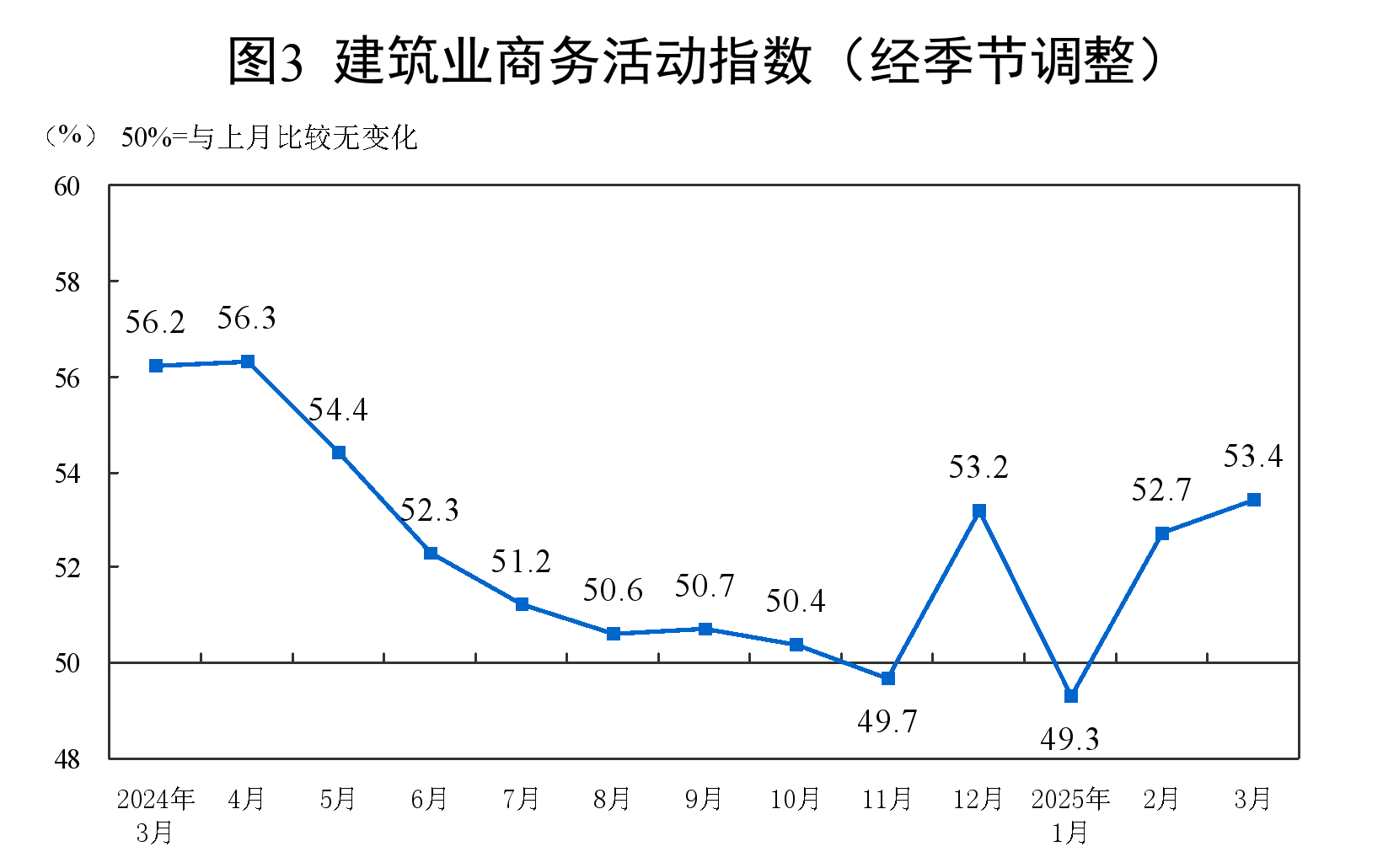 (二)建築業施工進度加快。受氣候轉暖,各地建設項目加快推進等因素影響,建築業商務活動指數繼續回升,為53.4%,比上月上升0.7個百分點。從市場預期看,業務活動預期指數為55.3%,升至較高景氣區間,建築業企業對近期市場發展信心有所增強。