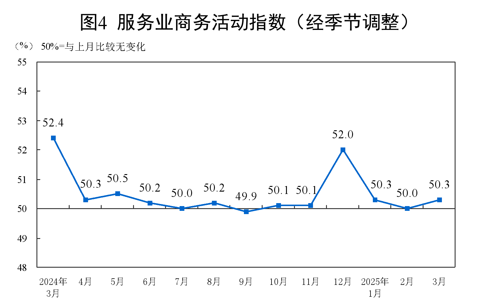 分行業看,建築業商務活動指數為53.4%,比上月上升0.7個百分點;服務業商務活動指數為50.3%,比上月上升0.3個百分點。從行業看,水上運輸、航空運輸、郵政、電信廣播電視及衞星傳輸服務、貨幣金融服務等行業商務活動指數均位於55.0%以上較高景氣區間;餐飲、生態保護及公共設施管理、文化體育娛樂等行業商務活動指數均低於臨界點。