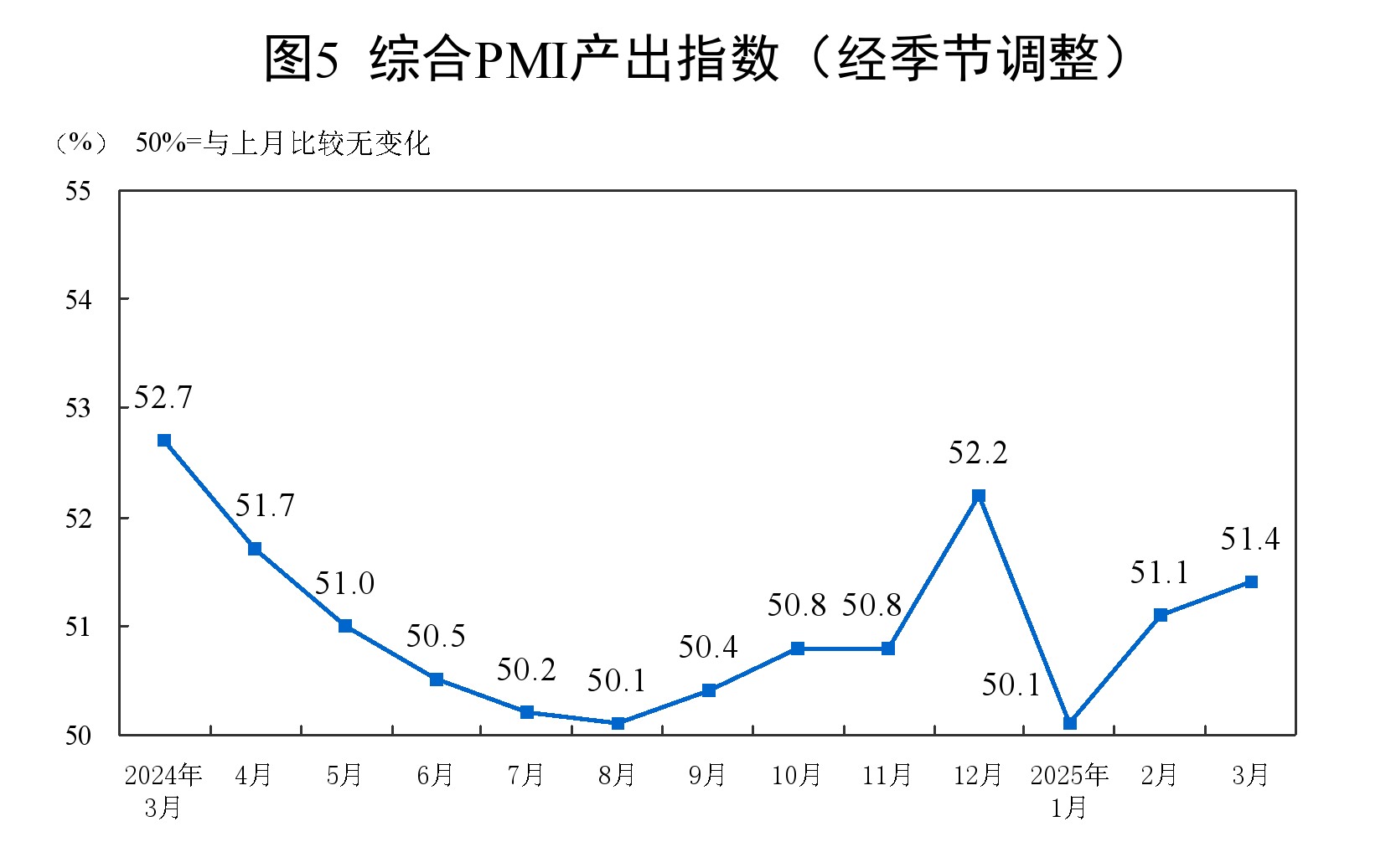 3月份,綜合PMI產出指數為51.4%,比上月上升0.3個百分點,表明我國企業生產經營活動總體擴張加快。