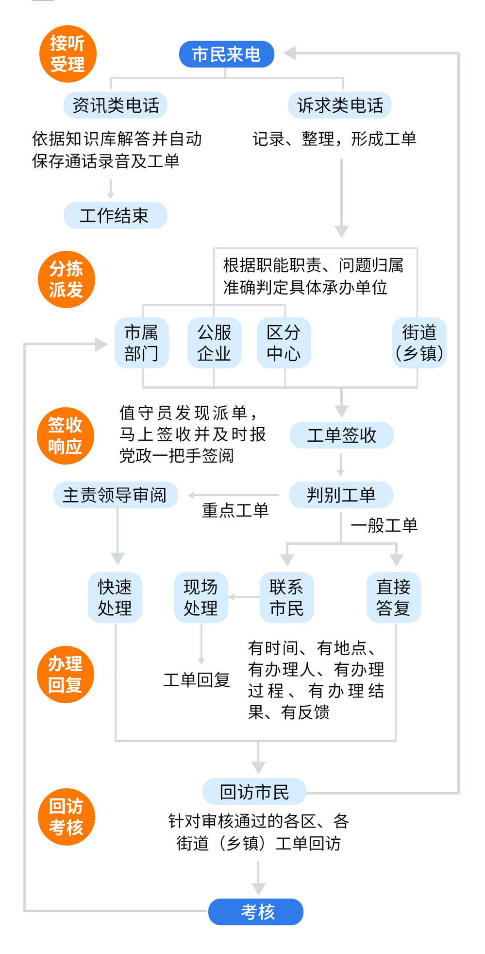 對於企業和羣眾的一般諮詢類訴求,12345熱線根據其構建的知識庫及相關政策文本解疑答惑即可,而對於非諮詢類的訴求,則由12345熱線進行派單,由相關部門按照職責分工辦理相關業務、實施監管執法或應急處置,工單辦理完結再由12345熱線向企業和羣眾進行反饋。