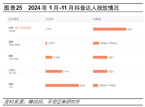 三隻松鼠也“瘋狂”與達人的合作。平安證券分析師發現,2024年1-11月,三隻松鼠已經與超過7萬名抖音達人合作,其中以腰部達人、小達人和尾部達人的合作居多,而且收益相當可觀。