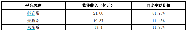 據財報,2024年三隻松鼠在抖音系平台的收入達到了21.88億元,首次超過了天貓系的19.37億元,抖音系的收入相較前一年同期增長了81.73%,遠超天貓系的11.45%和京東系的11.95%。在2023年,三隻松鼠在抖音平台的銷售為12.04億元,同比增長了118.51%。