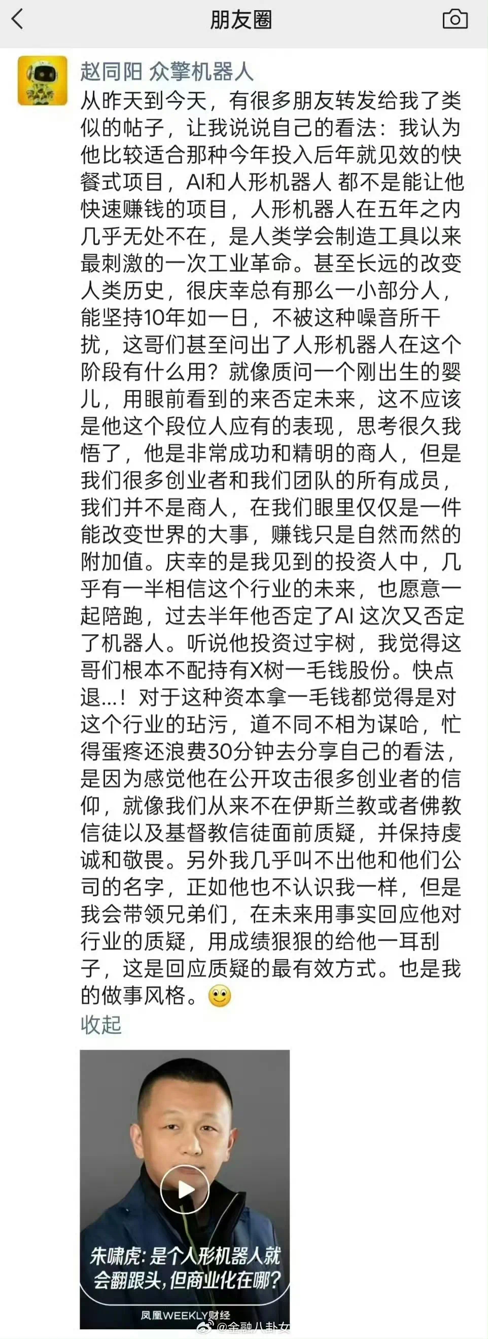 值得注意的是,眾擎機器人雖然沒有接受過金沙江創投的投資,但其CEO趙同陽依然“義憤填膺”,在朋友圈炮轟朱嘯虎就像質問一個剛出生的嬰兒,用眼前看到的否定未來,稱這不應是他這個段位人應有的表現。