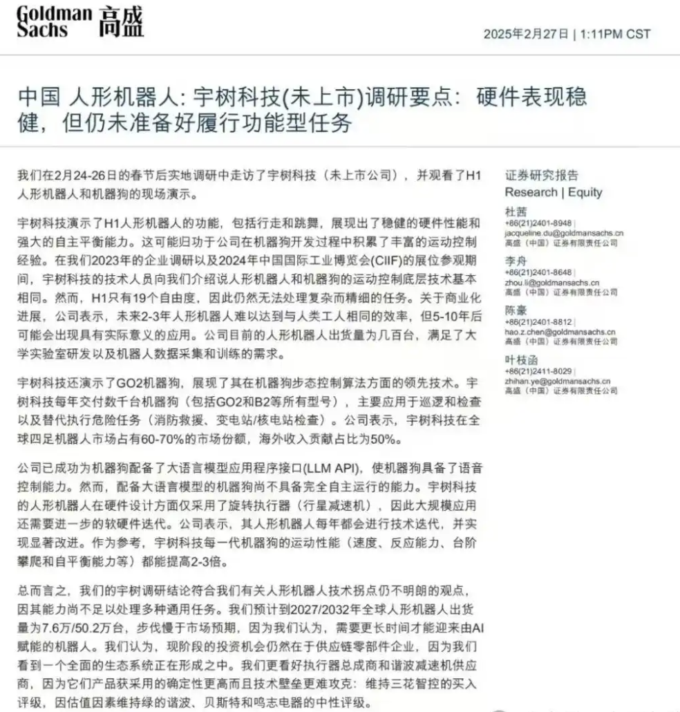 在宇樹機器人亮相春晚後,高盛隨即進行了走訪調研並於2月27日晚間發佈了一份名為《中國人形機器人:宇樹科技調研要點:硬件表現穩定,但仍未準備好履行功能型任務》的調研報告。