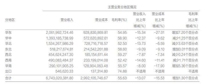 區域市場呈現“全線下跌”態勢。華東地區以20.62億元營收居首,但同比驟降15.34%;華中、華北分別貢獻13.93億、15.34億元,降幅12.37%、13.73%。