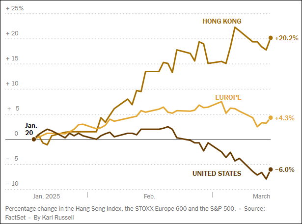 自今年1月20日特朗普宣誓就職以來,香港恒生指數(上)、歐洲斯托克600指數(中)和標普500指數(下)走勢變化圖。 《紐約時報》