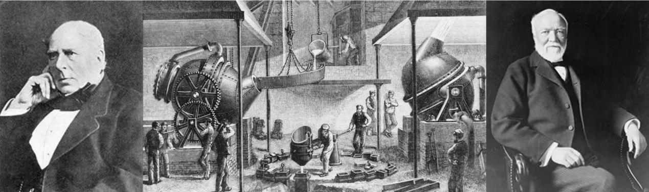 貝塞麥(左)、卡內基(右)和使用貝塞麥鍊鋼法的工廠(中)