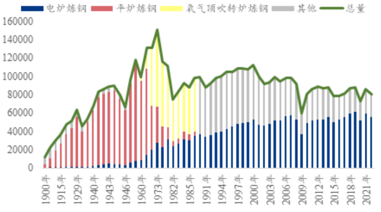 不同鍊鋼技術佔比變動(單位:千噸)。得益於電路鍊鋼和廢鋼回收能力的提升,美國鋼鐵技術在過去30年又有所領先,但規模效應已大不如初。圖表來源:Mysteel