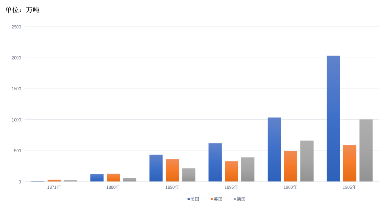 19世紀後期至20世紀初,美英德三國鋼鐵產量對比數據來源:世界鋼鐵工業協會數據