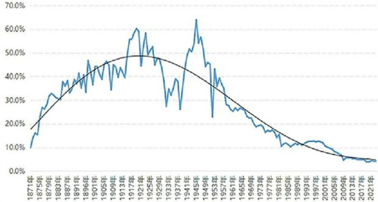 150年間美國粗鋼產量全球佔比變動情況數據來源:五礦經研院