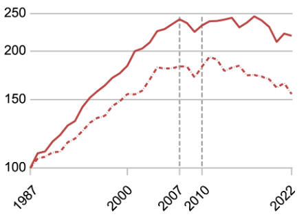 包括鋼鐵行業在內的美國製造業勞動生產率變化(實線為龍頭企業,虛線為其他企業),由此可見,特朗普的保護主義根本沒有阻止生產效率的下滑。圖表來源:紐約聯儲