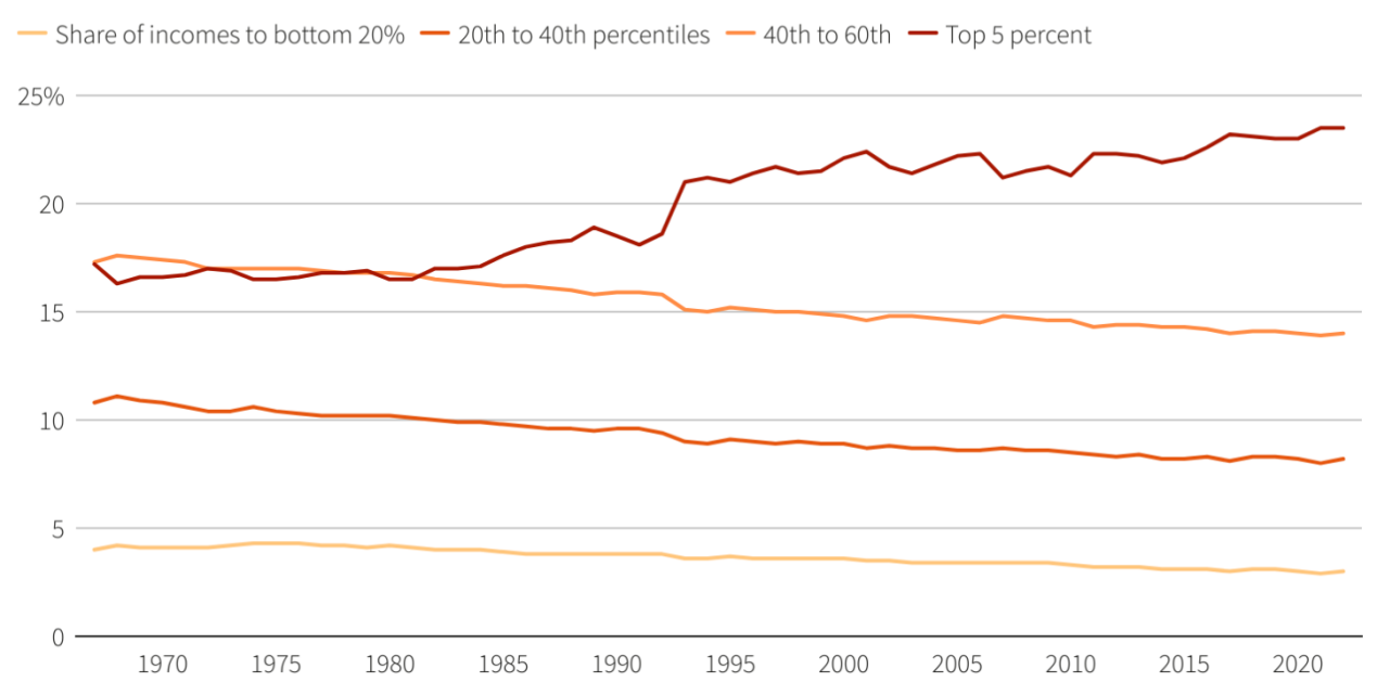 美國不同層級的收入佔比情況。半個世紀以來,只有最富有的5%人羣,其收入佔比還在不斷上升。圖片來源:路透社