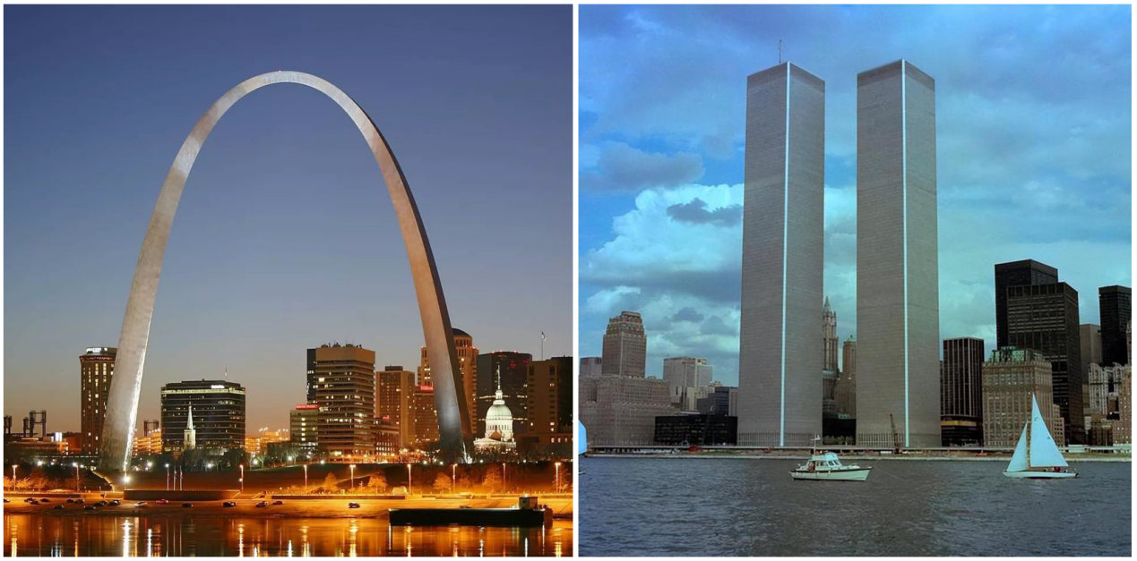 1965年建成的聖路易斯不鏽鋼大拱門(左),至今仍然是西半球最高的人造紀念碑。而1973年竣工的世貿中心(右),則是鋼框架套筒結構。這都是美國鋼鐵落日餘暉下的地標。