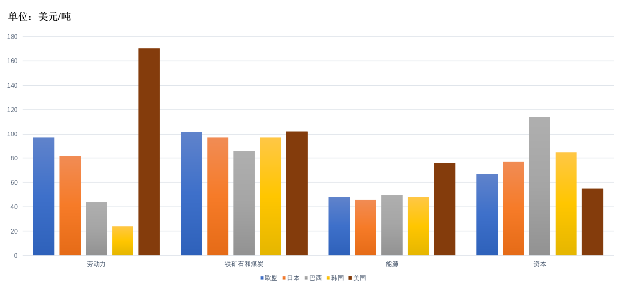 1984年美國與歐日巴韓各自噸鋼投入成本對比數據來源: 上海鋼聯研究中心轉引自AdamsandMueller(1986,107)