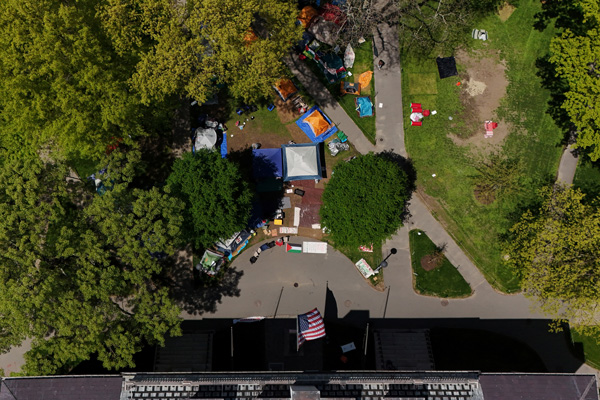 當地時間2024年5月13日,美國馬薩諸塞州劍橋市,巴以衝突持續,親巴勒斯坦示威者在哈佛大學校園內設立抗議營地。 IC photo