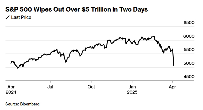 彭博社稱,這意味着標普500創下自2020年3月新冠疫情以來的最大單日跌幅;在500家成分股公司中,除了14家之外,其餘全部收跌。過去兩天,標普500指數下跌了創紀錄的11%,至11個月來最低水平,標普500成分公司被抹去市值5.4萬億美元。
