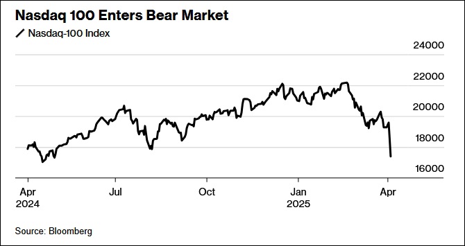 美國總統特朗普2日宣佈“對等關税”後,美國股市連續第二天跳水。當地時間4日,美股三大指數均暴跌超過5%。其中,標普500指數兩個交易日內蒸發市值達5.4萬億美元,創下新紀錄;納斯達克指數從近期高位累計跌超20%,確認進入熊市。