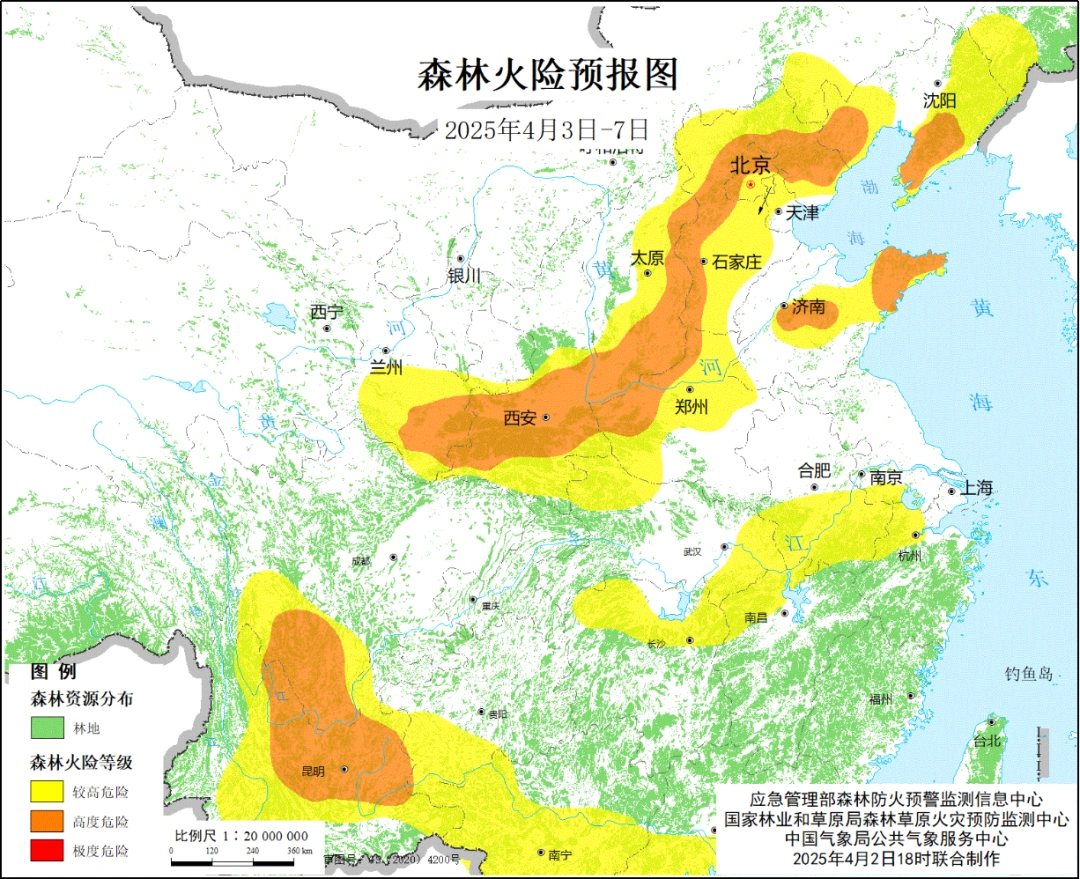 經綜合研判,4月3日至7日,北京北部和西部、河北北部和西部、山西東部和南部、遼寧西部和南部、山東中部和東北部、河南西部、四川南部、雲南北部和東部、陝西中部、甘肅南部的部分地區森林火險等級將維持高度危險級別。請密切關注火險變化,落實預警響應措施,持續加強火源管控,強化應急準備,有效應對當前嚴峻的高森林火險形勢。