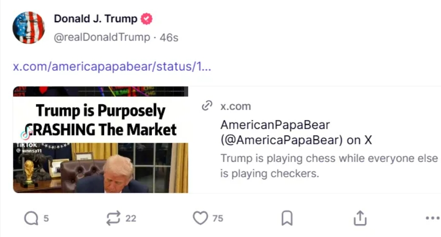 4日當天,特朗普通過其Truth Social賬户分享了一條X視頻帖子。視頻聲稱,特朗普故意讓股市崩盤,並倒逼美聯儲實施降息措施,以此解決美國政府債務負擔過重的問題,同時讓美國中產階級投資者更能買得起股票。視頻稱,巴菲特“認可”特朗普的做法,認為特朗普“正在實行他50多年來見過的最好的經濟舉措”。