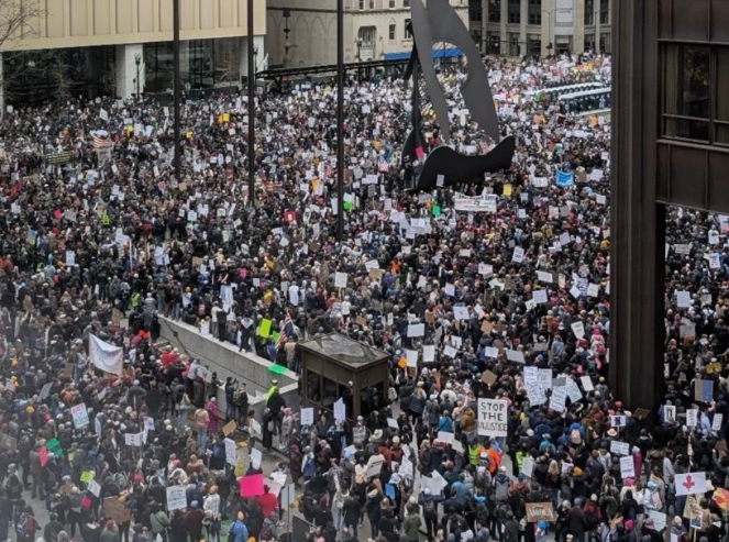 在曼哈頓的第五大道上,抗議隊伍延伸了近20個街區;在西雅圖,抗議者們舉着寫有“反對寡頭統治”等標語的牌子傾瀉着對特朗普的不滿;在芝加哥,數千人湧入戴利廣場和相鄰街道;在亞特蘭大,警方估計遊行前往州議會大廈的人數超過2萬人。