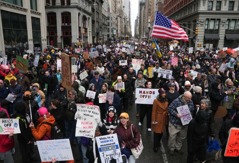 【文/觀察者網 劉程輝】驅逐移民、大規模裁員、全面加徵關税、大砍政府開支……特朗普政府上任後亂拳開打,一系列國內外政策造成前所未有的動盪。當地時間4月5日,從東海岸到西海岸,以“住手!”(Hands Off!)為口號的反特朗普示威浪潮席捲全美50個州數十座城市,反對政府削減開支、打擊移民和關税等政策,預計有超過60萬人報名參與全國各地的1200場抗議活動。這也是特朗普年初上任以來遭遇的最大規模單日抗議活動。