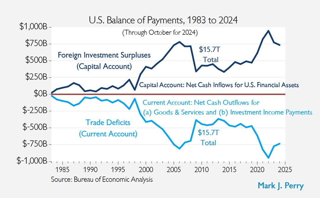 我想討論的是關税能不能起到縮減美國貿易逆差的作用呢?從上一輪美國加徵關税的結果來看,貿易逆差並沒有縮減。去年美國貨物貿易逆差大體是1.2萬億美元,比特朗普第一任期加徵關税前擴大了50%,美國對中國的貿易逆差是縮減了1/5,只是他對中國的貿易轉移到其他經濟體了,轉移到墨西哥,轉移到越南等東南亞國家。但是,美國對整個其他經濟體的貿易逆差並沒有縮減,反而大幅提升了。所以,加徵關税沒法縮減貿易逆差。