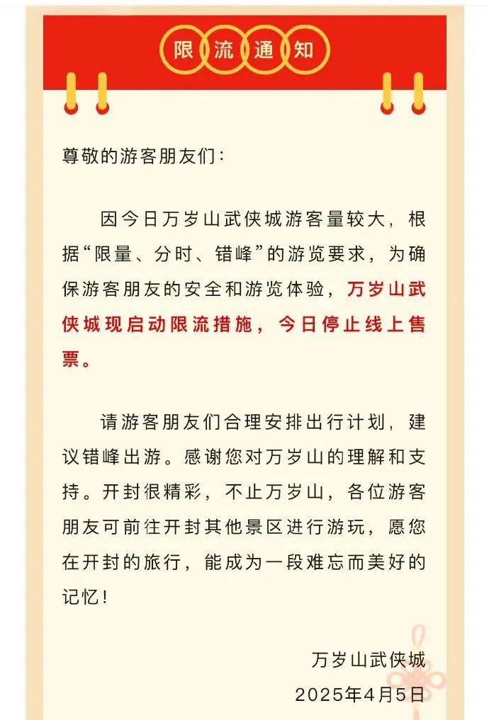 5日上午,景區發佈通知:因遊客量較大實行限流措施,停止線上售票。開封文旅局回應稱,景區確實已達最大承接量,為確保遊客安全也已通知景區進行優化管理。