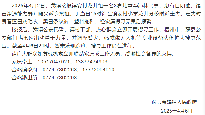 通報稱,2025年4月2日,金雞鎮接報鎮安村龍井組一名8歲兒童李沛林(男,患有自閉症,語言溝通能力弱)隨父返鄉祭祖,於當日15時許在鎮安村小學龍井分校附近走失。走失時身着藍白灰毛衣、黑白條紋褲、塑料拖鞋。經家屬搜尋無果後報警。