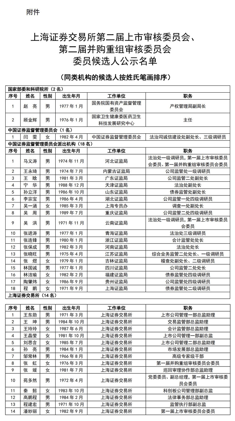 據上海證券交易所官網消息,上交所4月6日發佈上交所第二屆上市審核委員會、第二屆併購重組審核委員會委員候選人名單公示。