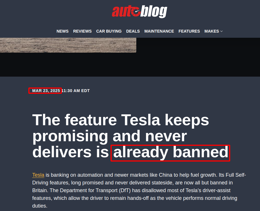 如英國擬規定特斯拉FSD換車道操作需要駕駛員的指令,甚至系統只能限定於簡單的公路條件使用,而不是複雜的城市道路,無人類駕駛員監督的全自動泊車可能也不能使用。特斯拉的FSD系統迄今為止仍沒有批准在歐盟各國使用,預計最早需要在2028年後才有可能上路,但可以預計特拉斯的FSD在歐盟的使用需要諸多限制條件。