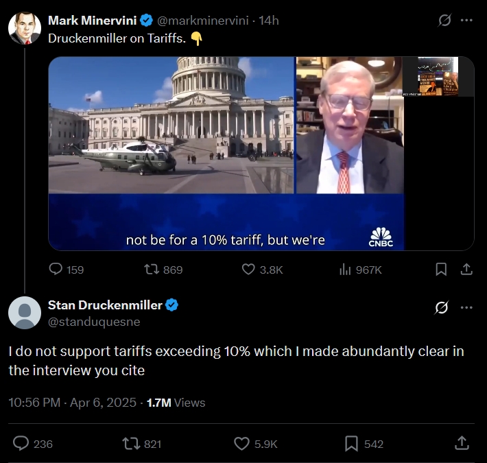 無獨有偶,美國著名投資人喬治·索羅斯的前“門徒”、杜肯資本創始人德魯肯米勒6日也罕見在X上發帖,明確表達了反對特朗普關税的立場。
