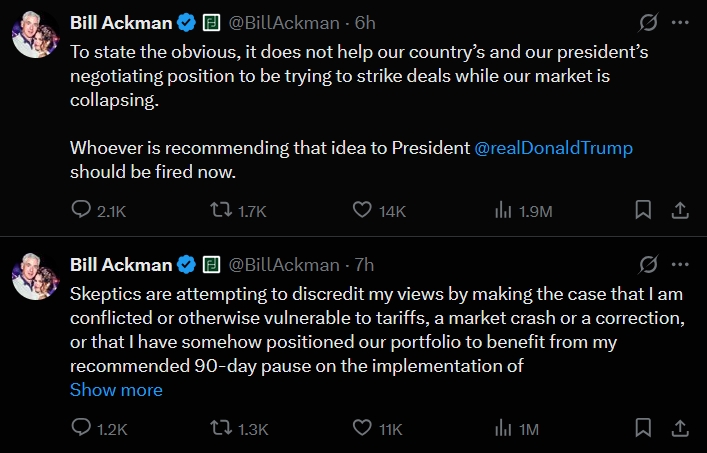 阿克曼呼籲特朗普將“對等關税”的實施暫停90天,期間通過談判解決所謂“不公平、不對等的關税協議”,並繼續吸引新投資進入美國。否則,阿克曼警告,美國將“走向一個自我引發的經濟核冬”。
