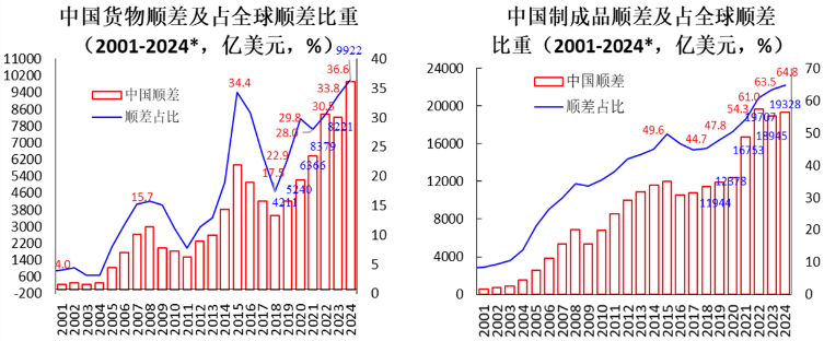 **特徵二:貿易順差及GDP佔比均較大幅度上升。**近年我國貨物貿易順差大幅飆升,2024年達到9921億美元,十四五前四年年均達到8222億美元,比十三五年均順差4451億美元超過84.7%。我國服務貿易持續處於逆差,十四五前四年年均逆差1550億美元,比十三五年均2377億美元下降34.8%。結果貿易總順差從十三五時期的2074億美元增長到前四年年均6672億美元,增幅兩倍多;貿易總順差佔GDP比例為3.67%,遠超十三五的1.34%。