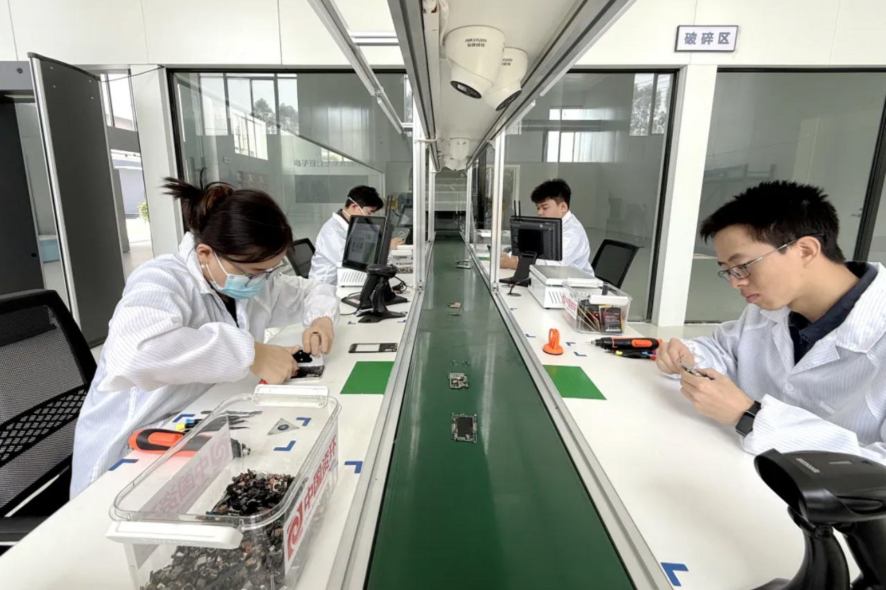 手機回收到廣東汕頭貴嶼處置基地後,在保密車間經過安全拆解、機械破碎、末端熔鍊,最終實現手機安全銷燬。同時,利用貴嶼火法項目優化技術路線,可將稀貴金屬有效提煉出來。手機的回收、流轉、拆解和破碎等流程全程可視化、可監控、可溯源。