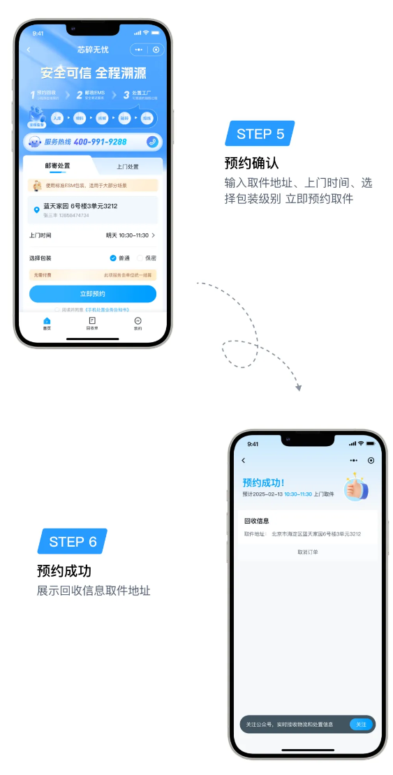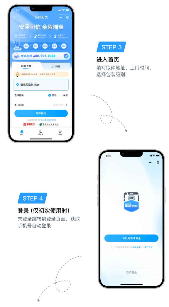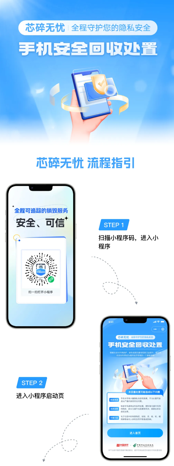 依託中國資環手機安全回收處置模式,4月3日起,各省會城市的消費者可通過“芯碎無憂”小程序下單,既可以選擇上門現場破損服務,也能選擇郵寄保密回收。