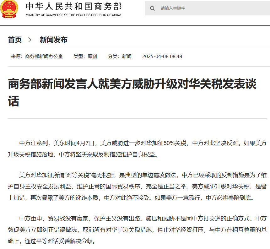 據商務部網站4月8日消息,商務部新聞發言人就美方威脅升級對華關税發表談話。
