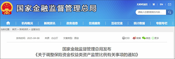 據國家金融監督管理總局網站4月8日消息,為深入貫徹落實中央金融工作會議決策部署,提升保險資金服務實體經濟質效,國家金融監督管理總局近日印發《關於調整保險資金權益類資產監管比例有關事項的通知》(以下簡稱《通知》),優化保險資金比例監管政策,加大對資本市場和實體經濟的支持力度。