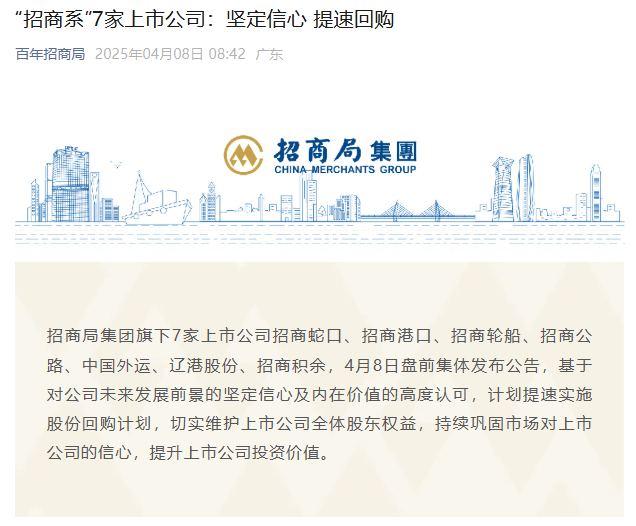 據招商局集團有限公司微信公眾號“百年招商局”消息,招商局集團旗下7家上市公司招商蛇口、招商港口、招商輪船、招商公路、中國外運、遼港股份、招商積餘,4月8日盤前集體發佈公告,基於對公司未來發展前景的堅定信心及內在價值的高度認可,計劃提速實施股份回購計劃,切實維護上市公司全體股東權益,持續鞏固市場對上市公司的信心,提升上市公司投資價值。