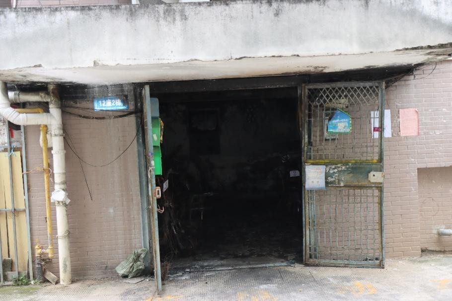 事故現場西莊小區12號樓2梯一層門廳全部過火,門廳內電動自行車、配電箱、弱電箱和堆放的雜物燒燬,牆面呈潔淨燃燒痕跡;一層樓梯間內煙燻痕跡重,自行車和雜物表面有高温烘烤熔融變形痕跡。二層以上樓層未過火,但有煙燻痕跡,且樓層越高,煙燻痕跡越淡;二至五層樓梯間吸頂燈掉落,六層和七層吸頂燈完好;二層 103和104入户門局部因高温烘烤變形,三層以上各入户門及門鎖完好。